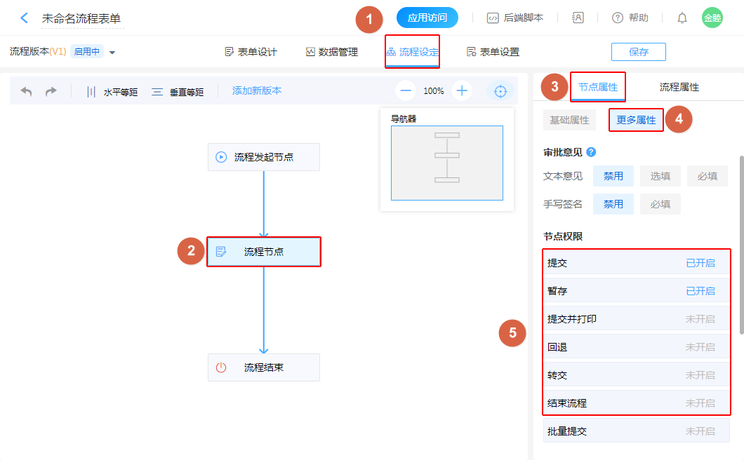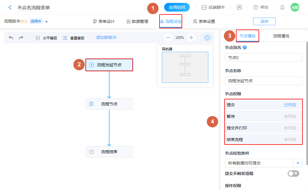 ①、新建流程操作(提交、暂存、结束流程),均在“起始节点”中配置。