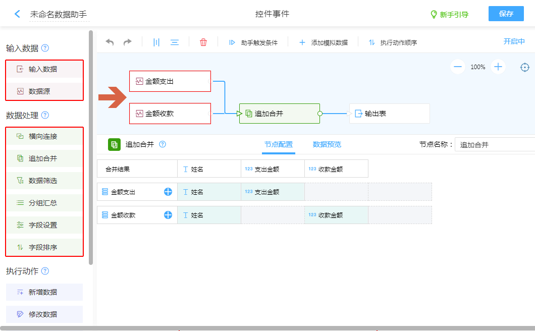 常用于将两个同类型表单合并到一张表里,默认将同类型同名字段合并为一列,对于同类型字段可以手动拖拽合并为一列。