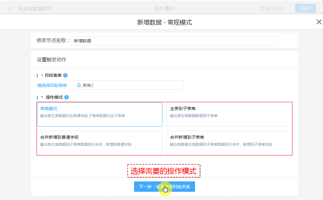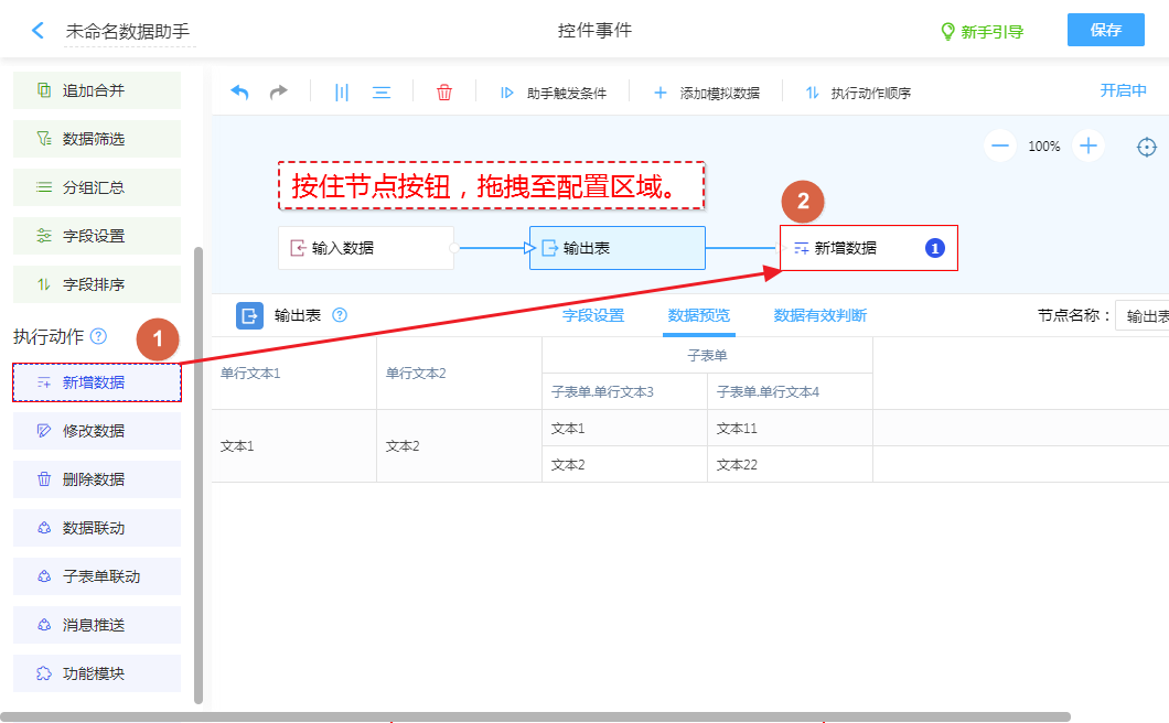 创建“新增数据”动作节点,将“输出表”的数据新增至其他表单。