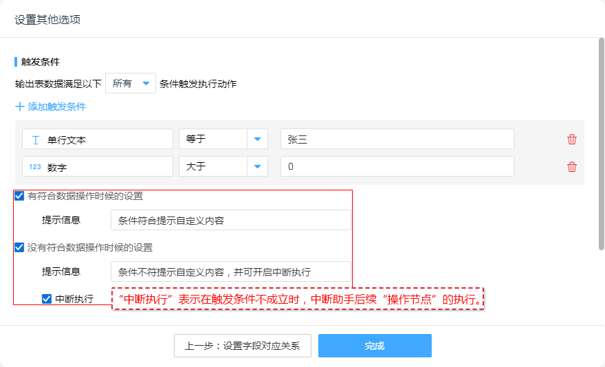 • “中断执行”表示在触发条件不成立时,中断助手后续“操作节点”的执行。