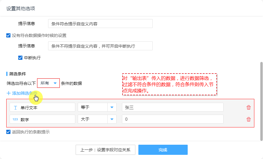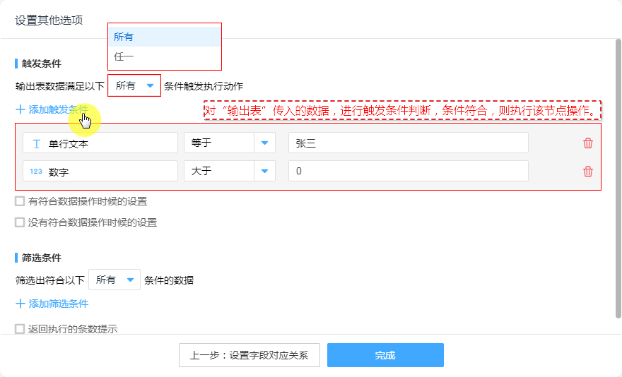 1. 输出表数据满足以下“所有”条件触发执行动作。