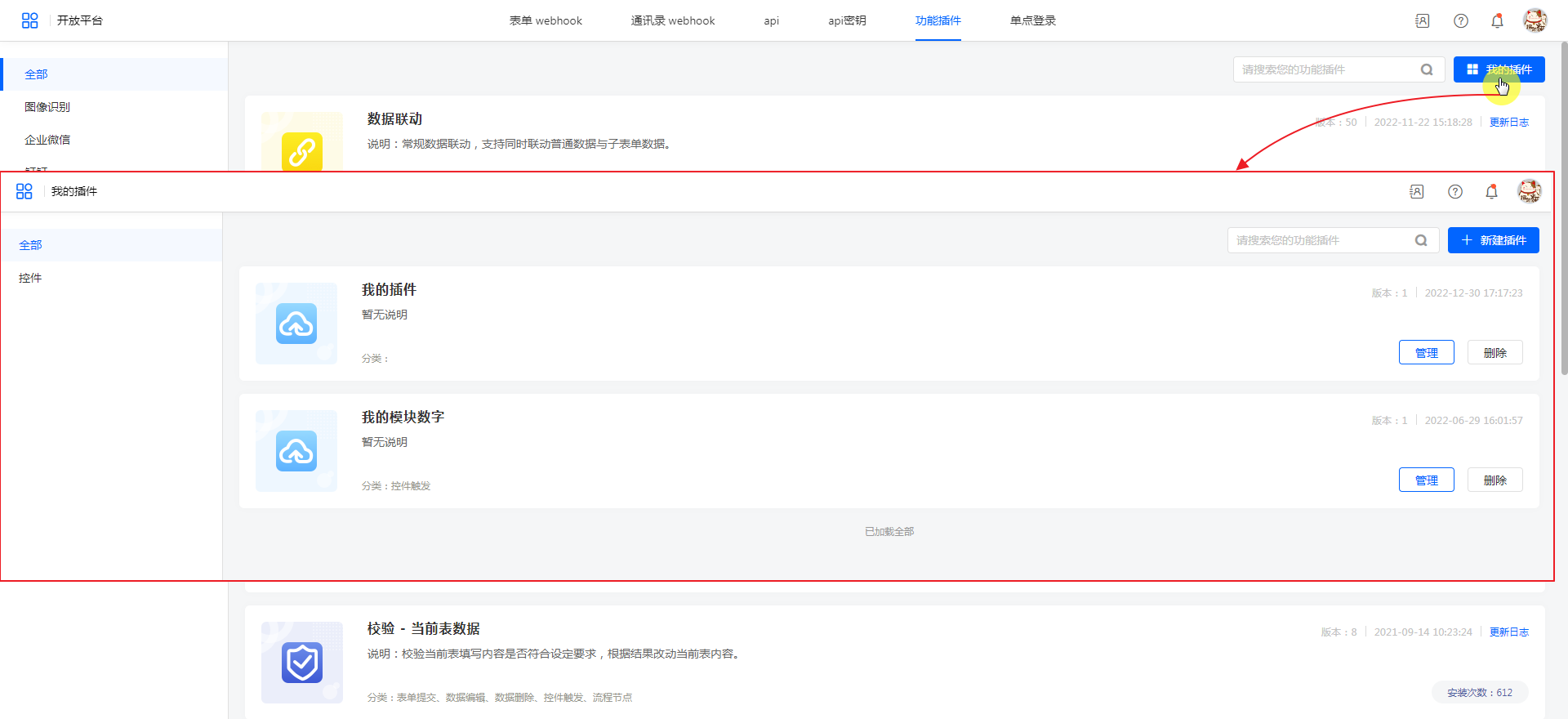 我的插件中仅展示当前账号个体自行设计的功能插件,仅当前个人可见可使用。